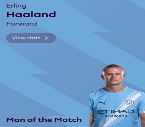 此役客场对阵水晶宫,哈兰德在比赛第41分钟和第89分钟各入一球,上演梅开二度,帮助曼城3-0取胜。