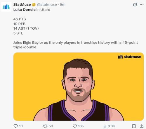 6.东契奇是湖人队史首位45+三双+5抢断的球员;